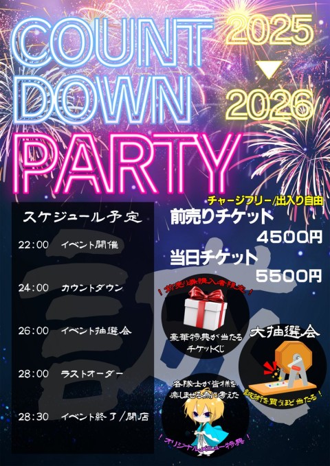 🎊COUNT DOWN PARTY 新年を迎える瞬間を隊士と過ごしませんか? 例年とは一味違う年末をお届け! POINT1⃣ 前売りチケット購入者限定👑豪華特典くじ POINT2⃣ 誠術を買えば買うほど当たる🎉大抽選会 POINT3⃣ 隊士が考えたオリジナルメニュー✨ チケットの購入/予約は隊士までお問い合わせください https://t.co/k7oOCWf6MF