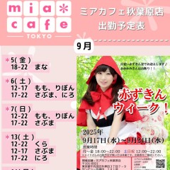 赤ずきんウィークinミアカフェ秋葉原店 2025年9月17日(水)~24日(水) 9月19日(金)  18-22 まな・初回勤務の新人さん 9月20日(土)  12-17 もも・りぼん  17-22 さぶま・くら 9月21日(日)  12-17 さぶま・もも  17-22 くら・まな 出勤一覧  https://t.co/inbQ85tzfB https://t.co/tDcSyyR3ho