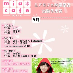 ★メイドカフェ・ミアカフェ #秋葉原 店★ ☕️営業予定日☕️ 🎀9月13日(土)  12-22 くら  12-17 さぶま  17-22 にろ 🎀9月14日(日)  12-17 みさ、新人さん【初お給仕】  17-22 さぶま、くら  リラ&フォトお呼び出し みれい 🎀9月15日(月祝)  12-17 さぶま  17-22 おとめ【卒業】、まな https://t.co/pLZUgClAe3