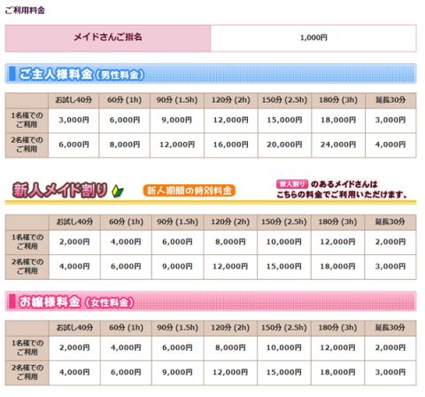| 内容 | ●オプション 写真撮影 メイドさんの萌えポーズを撮影(5枚まで) 1,000円 写真撮影∞ 枚数無制限で写真撮影 2,000円 ツーショットチェキ メイドさんのメッセージ付チェキ!(2枚) 1,000円 雨もへっちゃら相愛傘 雨の日限定!メイドさんとアイアイ傘 ※オプション用のカサを貸し出しいたします 1,000円 ゆびずもう メイドさんと、のこったのこった指相撲3回勝負 1,000円 萌えレコ お客様の携帯へメイドさんが萌えボイスを録音♪ (3フレーズまでOK) ※録音機能のある携帯電話をお持ちの方に限ります ※転用防止のためご主人さまのお名前を入れさせて頂きます。 1,000円  |