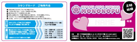 | 特典 | ・ 1000円ご利用につき1ポイント押印致します。 ・ 雨の日のご来店はスタンプを2倍押印致します。 ・ 紛失した際は集めたスタンプ数が無効となります。 ・ 有効期限は最後にご帰城された日から60日です。 |